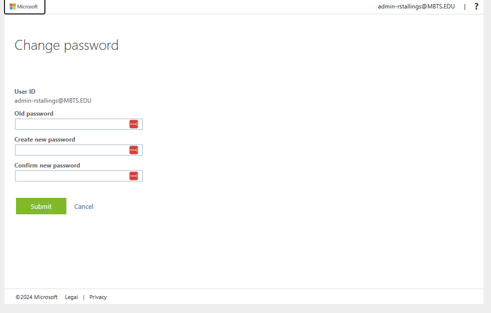 3. Enter your current password. Then, enter your desired password. Confirm the new password. Then, press Submit.