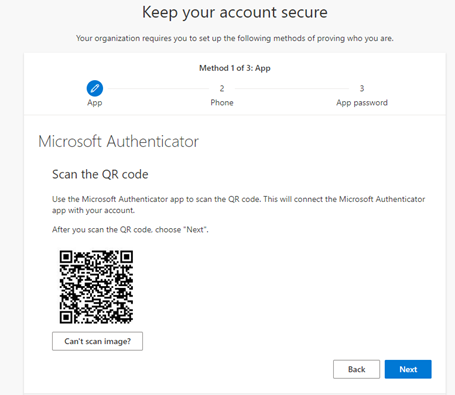 - In your Microsoft Authenticator app, Click the “+” to add a new account, then select “Work or school account” and select the “Scan QR code” option.